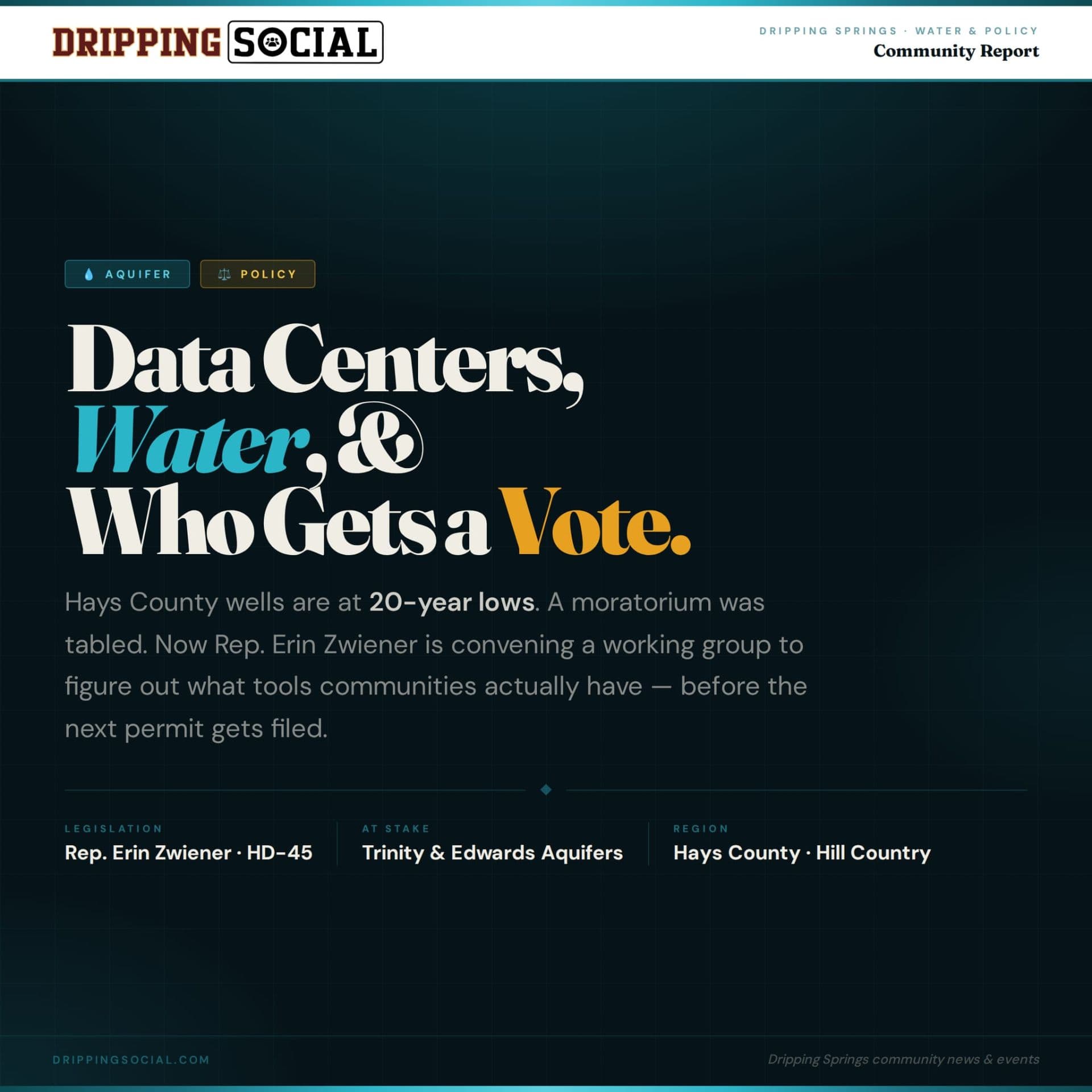 #DrippingSocial #DrippingSprings #HaysCounty #WaterConservation #HillCountry #TexasWater #EdwardsAquifer #TrinityAquifer #Groundwater #DrippingSpringsTX #ErinZwiener #LocalNews #CentralTexas #JacobsWell #Wimberley